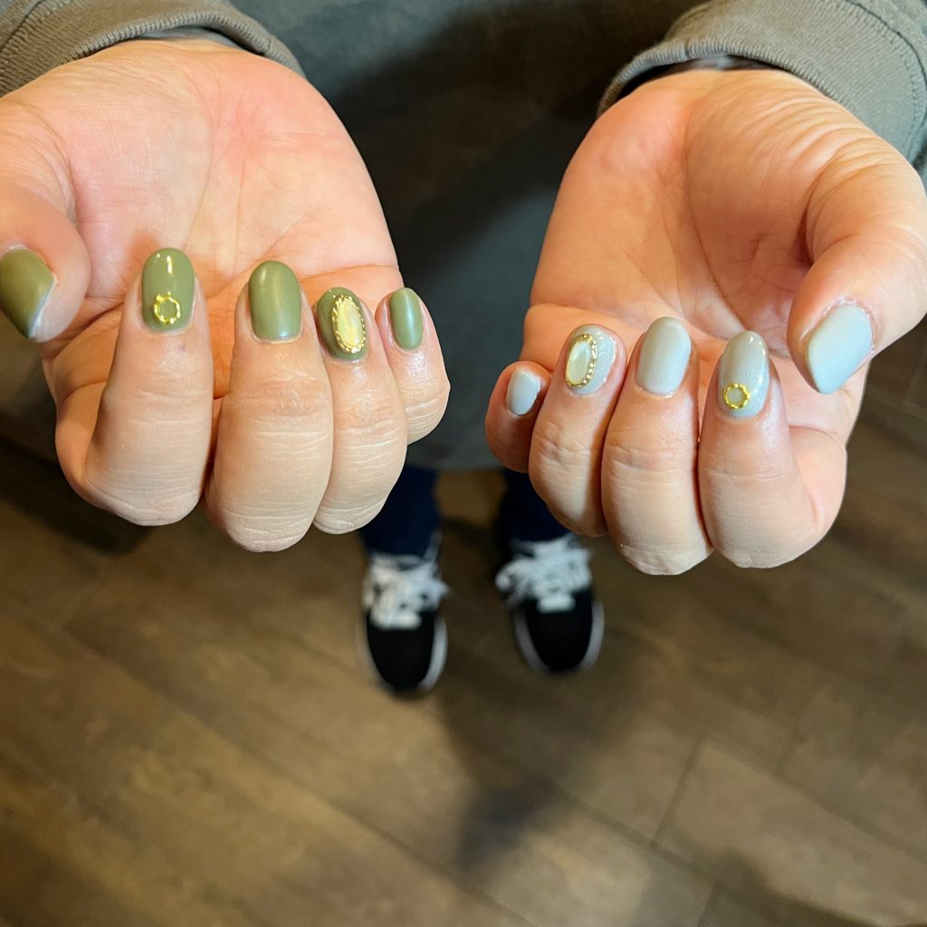 カーキ×グレー アクセ風パーツネイル  お客様ネイルハンド